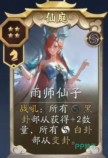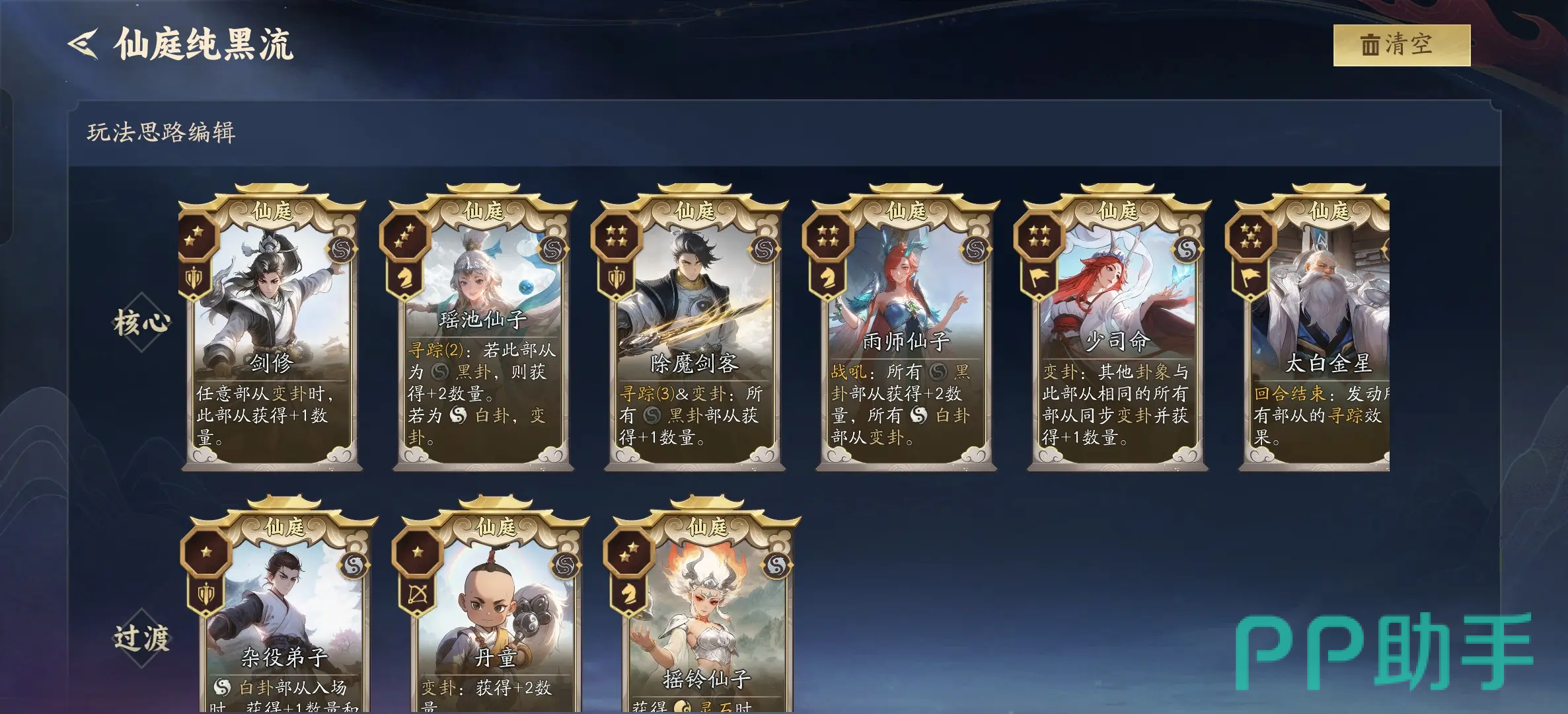 第二套则是纯黑流,核心卡牌为瑶池仙子和除魔剑客,前期同样利用基础弟子过渡,进入到中后期阶段,此时瑶池仙子,除魔剑客,救苦仙尊,还有太白金星,可不断触发寻踪效果,刷出大量黑卦,以此快速提升战力,天罡星君依然是关键角色,可提高刷出的效率,后续甚至能替换雨师仙子;