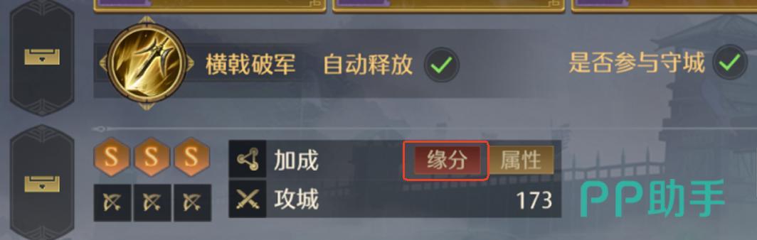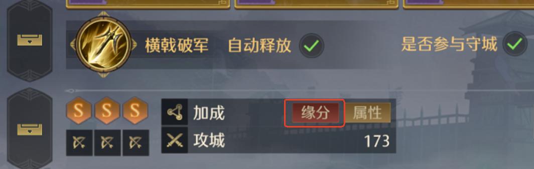 大家在编队界面就可以看到最下面放有个加成,旁边还有一个缘分图标,比如说有的武将对应的兵种属性是S,那么如果队伍里都有3个武将弓兵都是S,那么还能激活3S属性额外加成。