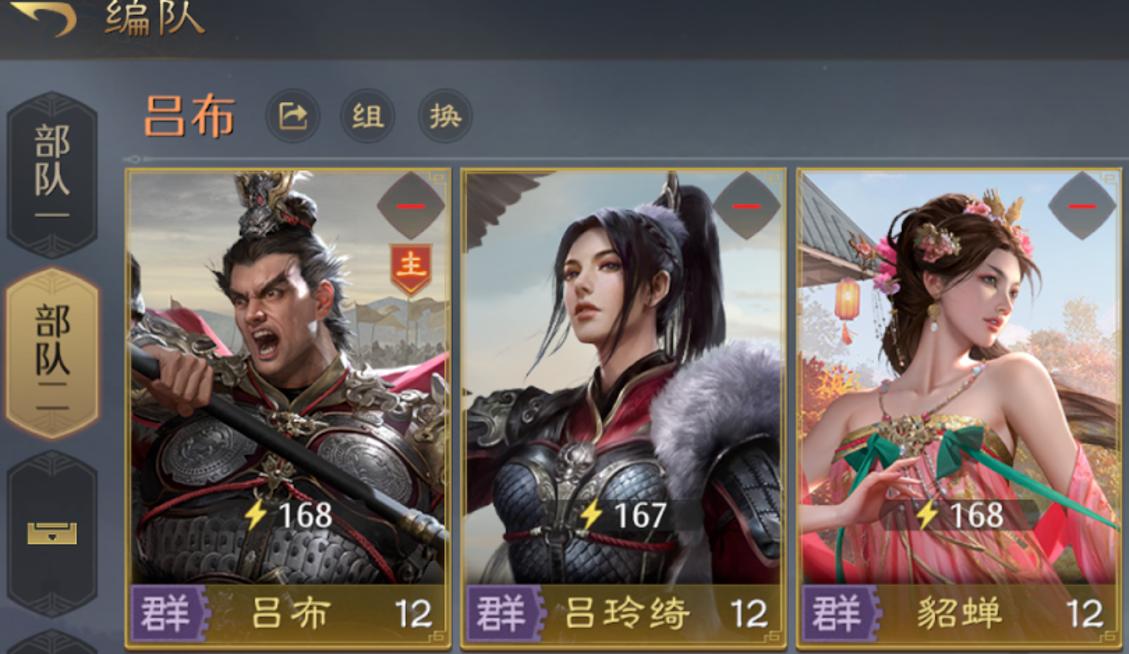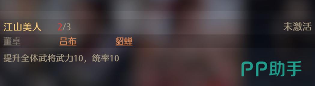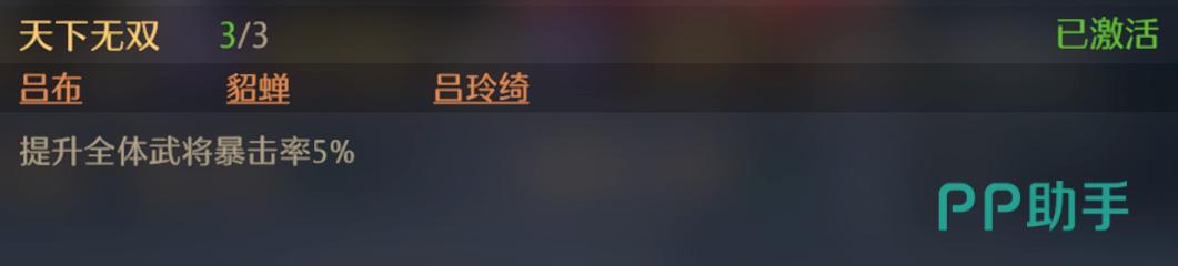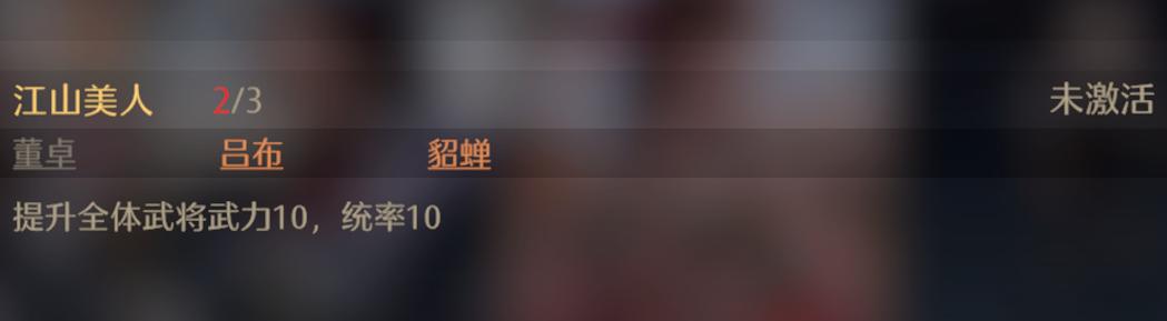 如果满足缘分要求就可以激活加成,会直接显示出来,吕布+貂蝉+吕玲绮,刚好是一家子,可以激活“天下无双”效果,全体武将暴击率加5%。而吕布+貂蝉+董卓能激活“江山美人”缘分,全体武力+10统率+10,这里只有吕布貂蝉没有董卓就无法激活该缘分。