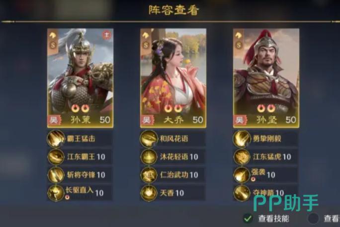 激活方法其实很简单,只要是满足要求的武将编入同一个队伍就能生效,有的是双人羁绊效果,有的则是需要3人羁绊效果,例如大乔+孙策+孙坚,这三位都是东吴阵营的,就可以直接激活“江东霸主”效果。