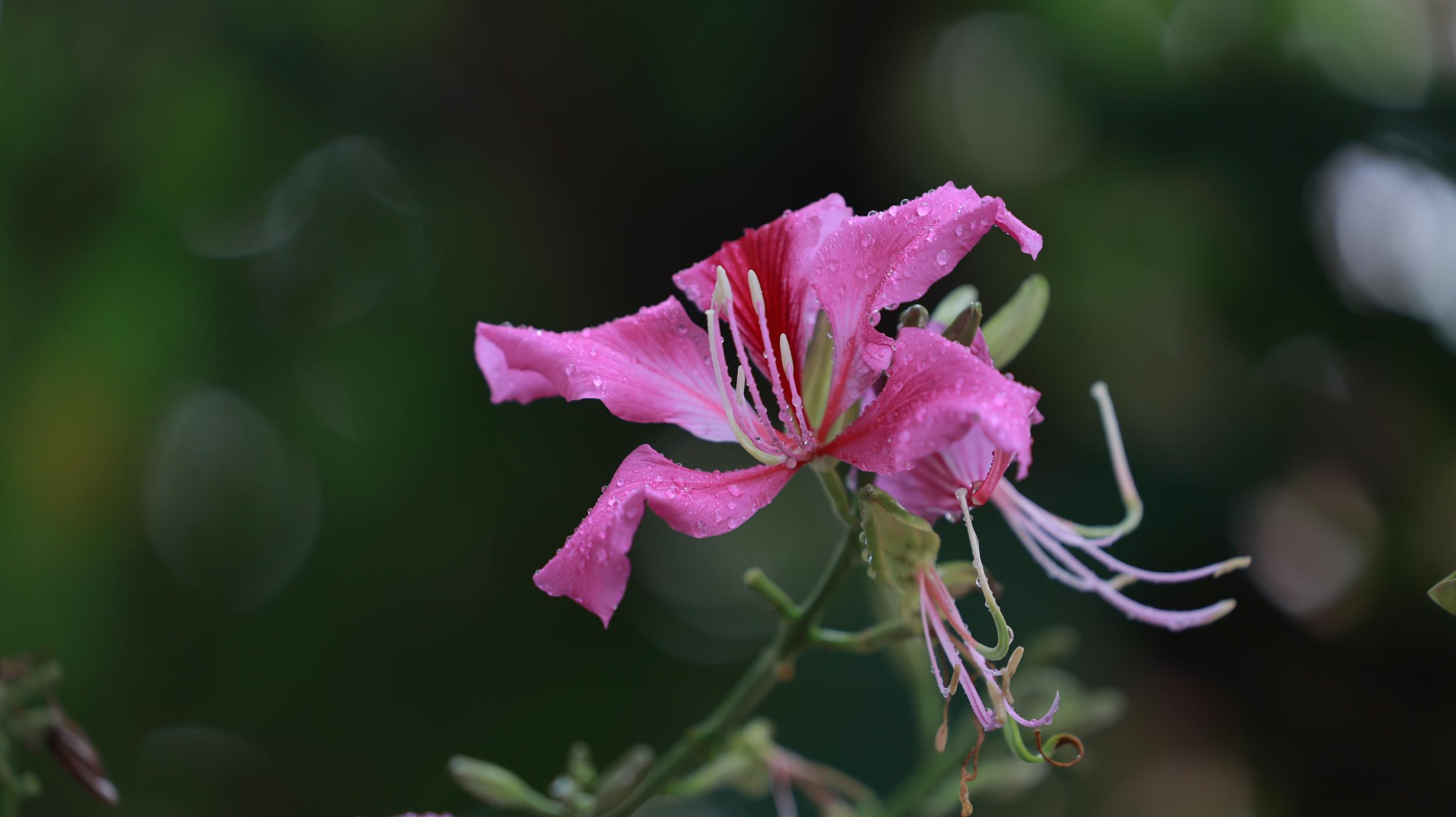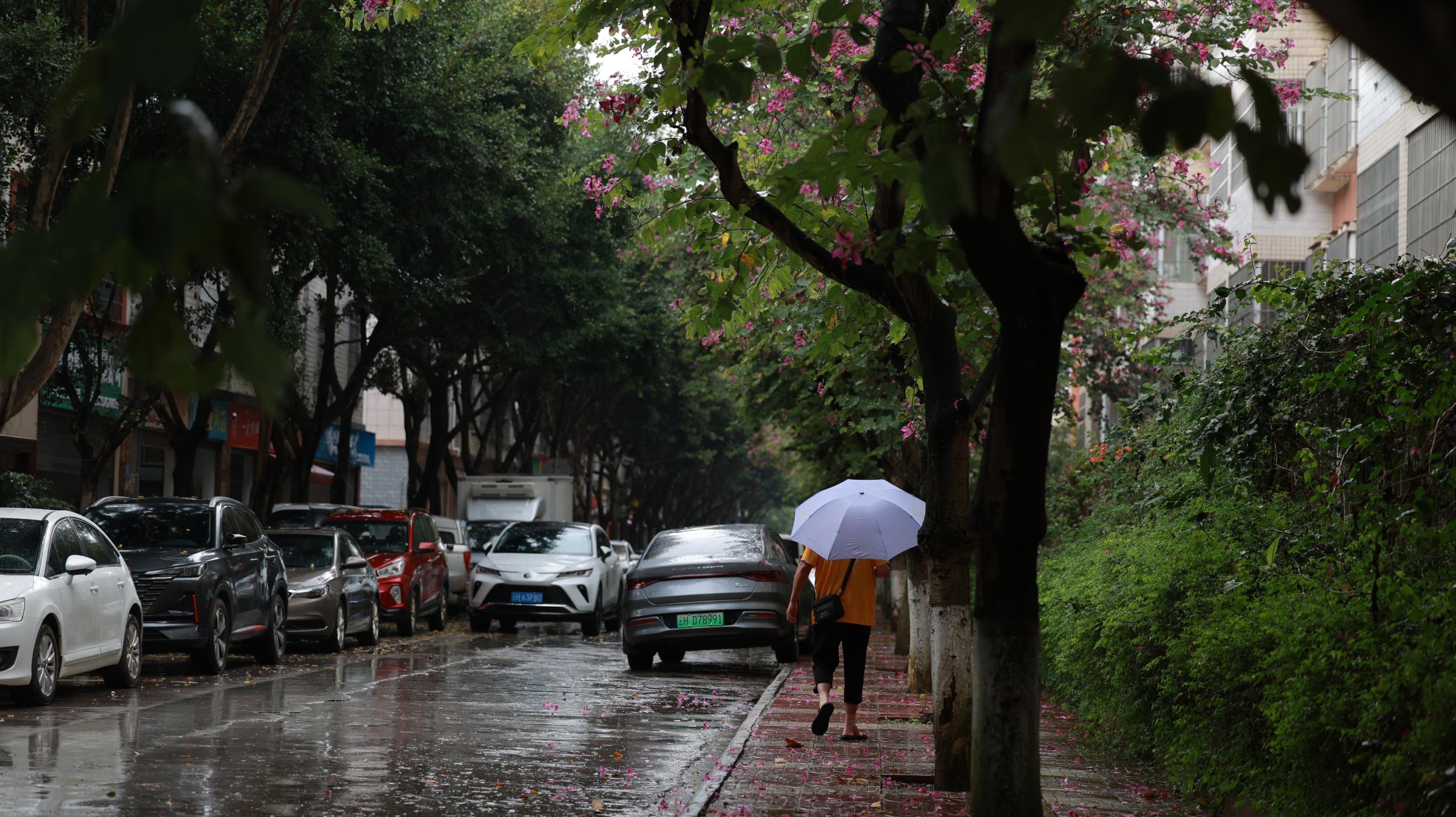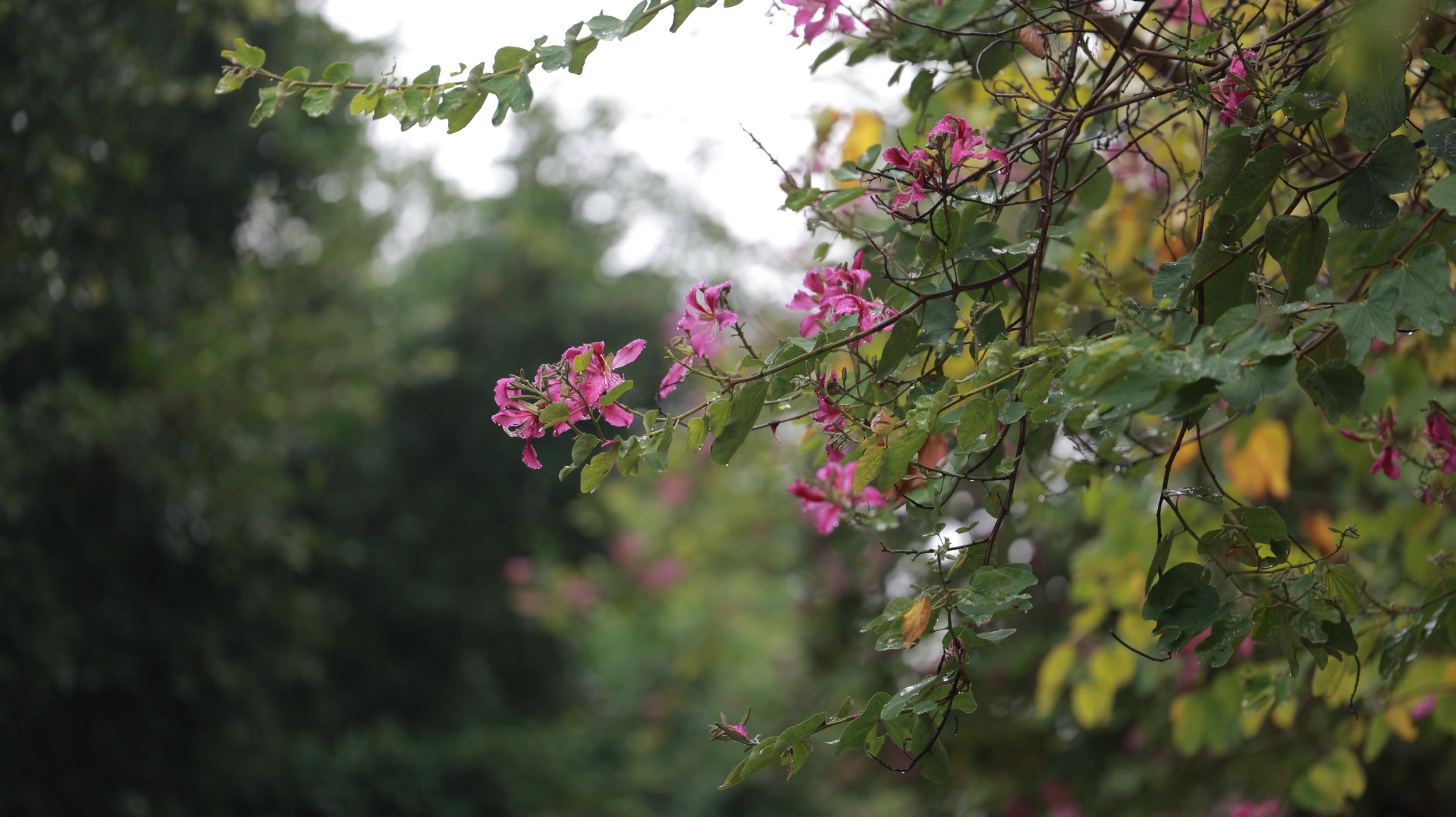 若逢一场秋雨,文山的紫荆花便添了几分江南的婉约。雨珠顺着花瓣滚落,在地面溅起细碎的水花,空气中弥漫着泥土与花香的混合气息。此时,紫荆花的叶子更显鲜亮,如小羊蹄印般俏皮地铺展在枝头,与落花共织一地斑斓。