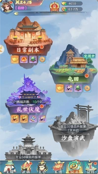 游戏玩法还是比较简单的,四大玩法日常副本、屯田、乱世伏魔、沙盘演武等都能随着游戏的进度慢慢的解锁,并且后期还能开启军团征战等玩法,对战内容非常的丰富,并且不占用玩家过长的游戏时间,基本上是每天上线都能用来打法无聊的时间。