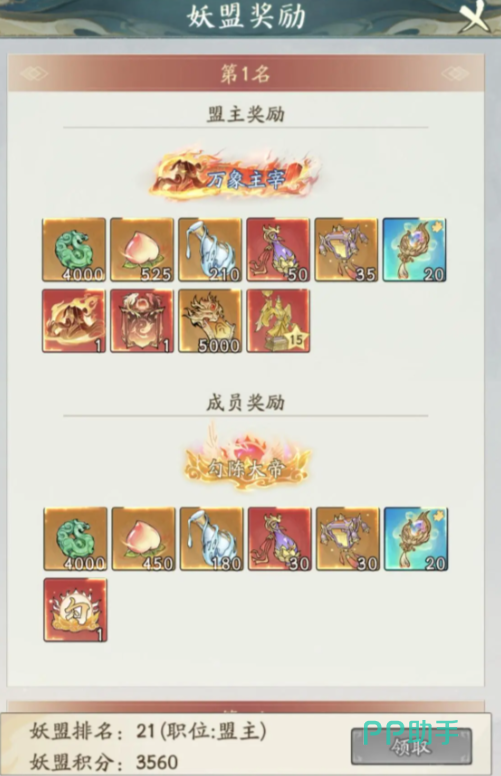 活动结束后,大家本身会根据总战功值进行排名,妖盟则根据不同轮次拿到的积分总和来进行排名,最后排名第一的妖盟能拿到造化至宝碎片等奖励,除了排名奖励外,完成对应成就,也能拿到“女娲补天石”碎片。