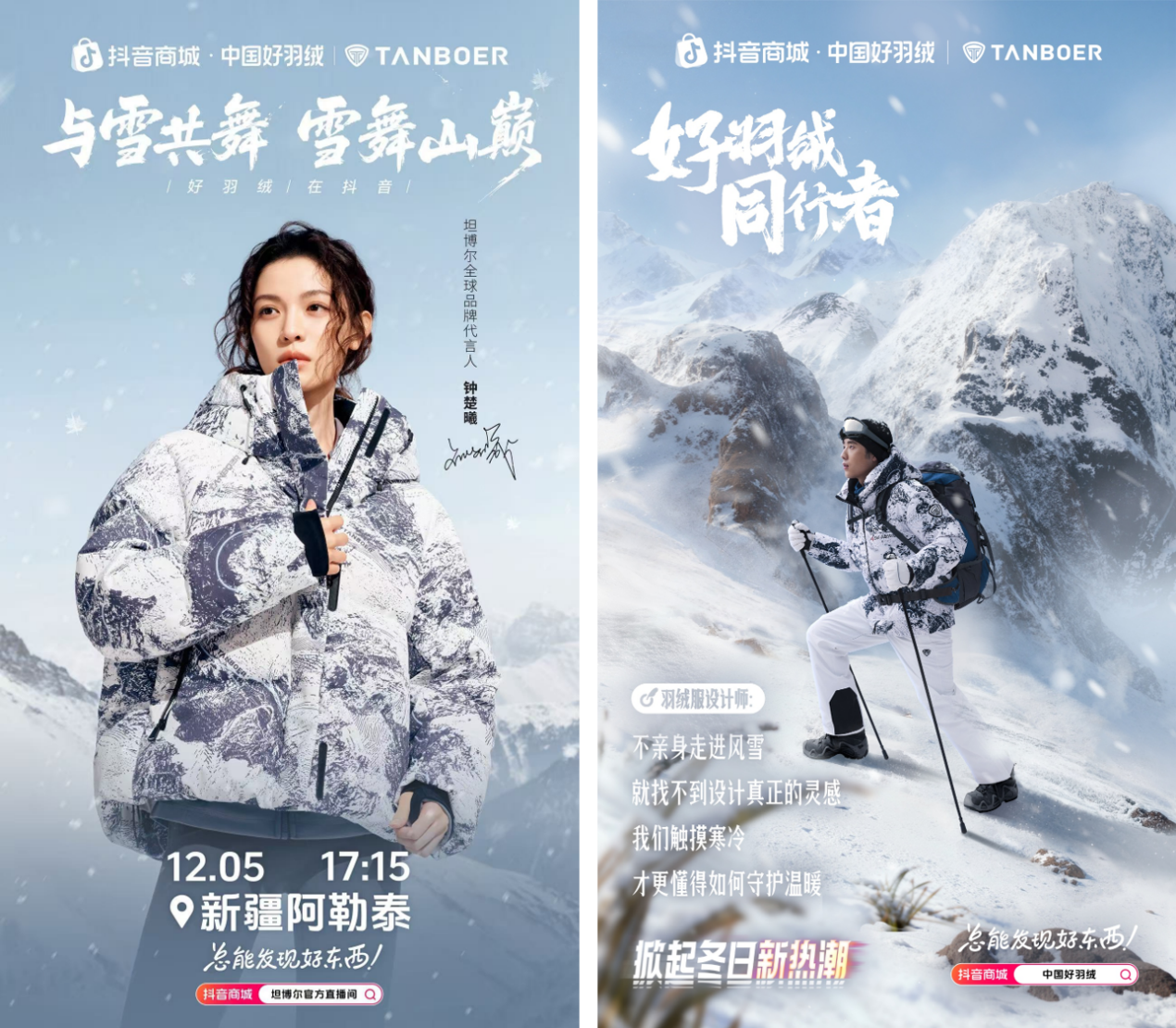 传统户外品牌活动常以小众作为标签,而坦博尔选择用“派对”这一轻松、社交、沉浸式的形式打破刻板印象。它把抖音“中国好羽绒”IP的线上流量,直接导流到线下体验中,邀请全球品牌代言人钟楚曦化身坦博尔全民“户外造型师”空降坦博尔雪顶直播间,带领观众开启浪漫「雪山夕阳派对」,在真实的场景下,体验和感受产品的性能表现。