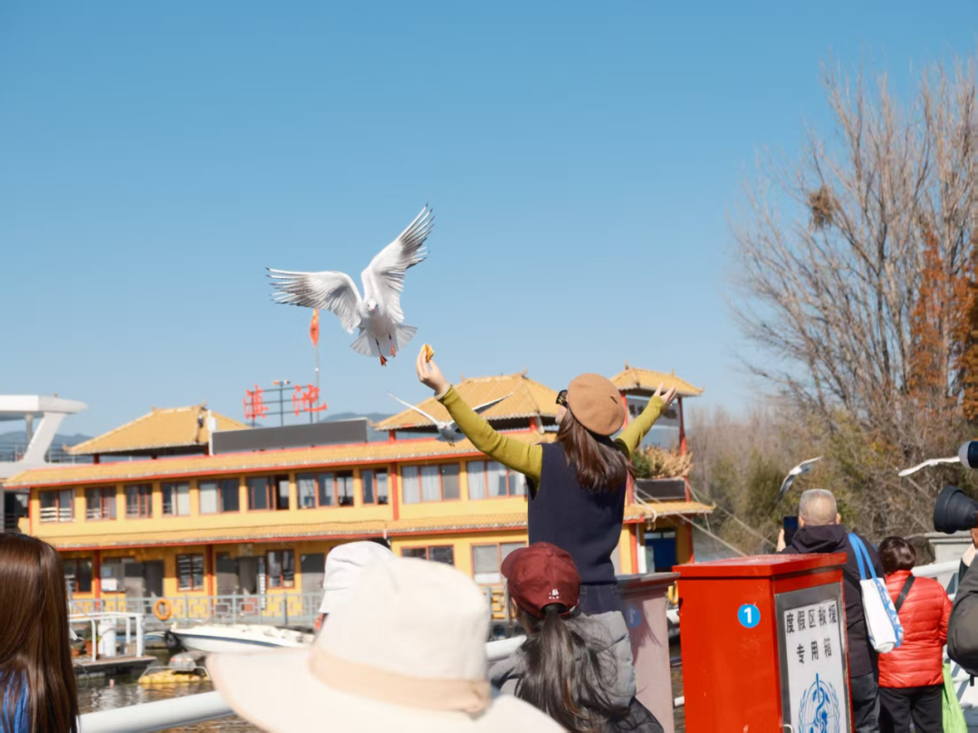 游客在滇池畔与红嘴鸥互动 陈思蒙 摄
