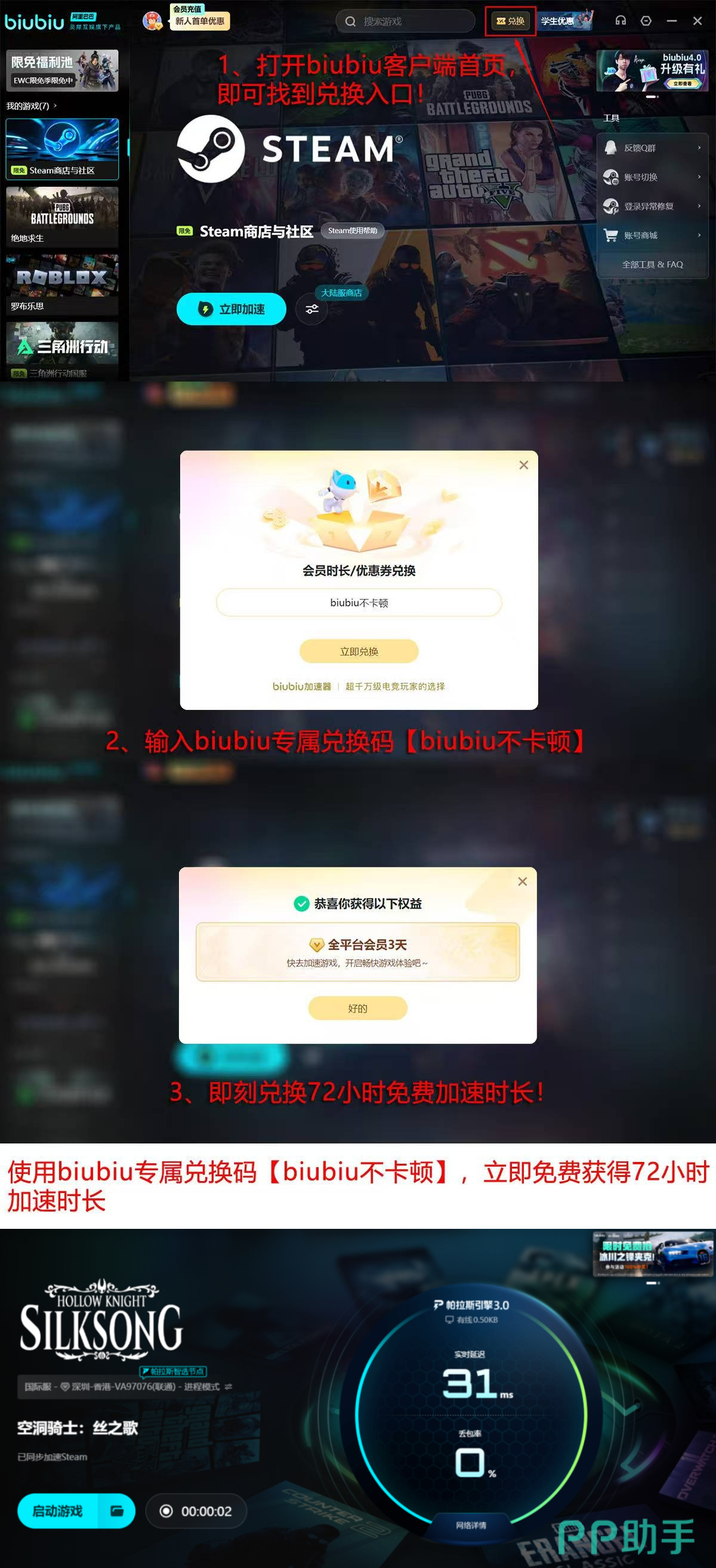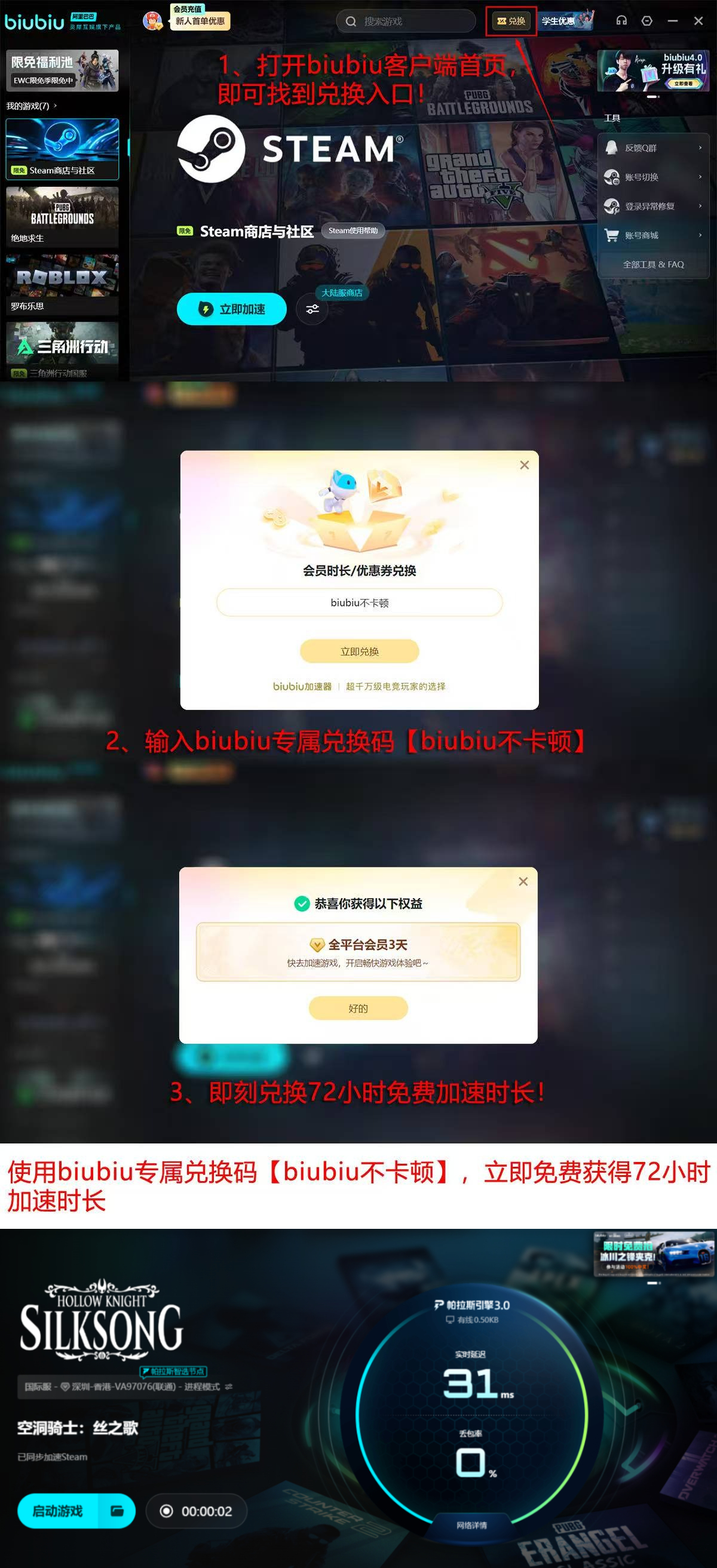 当前新用户可享专项加速权益:注册即赠全功能免费试用24小时;输入激活码【biubiu不卡顿】,额外获赠高级加速服务72小时,累计可连续使用优质加速达96小时。