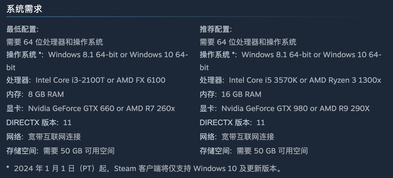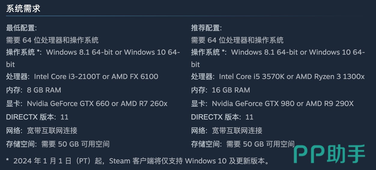 本作在PC平台提供两套硬件标准:最低配置需搭载Intel Core i3-2100T处理器、NVIDIA GeForce GTX 660或AMD Radeon R7 260x显卡,并预留50GB可用存储空间;推荐配置则建议使用Intel Core i5-3570K处理器、NVIDIA GeForce GTX 980或AMD Radeon R9 290X显卡,可保障高帧率稳定运行与更细腻的画质表现。