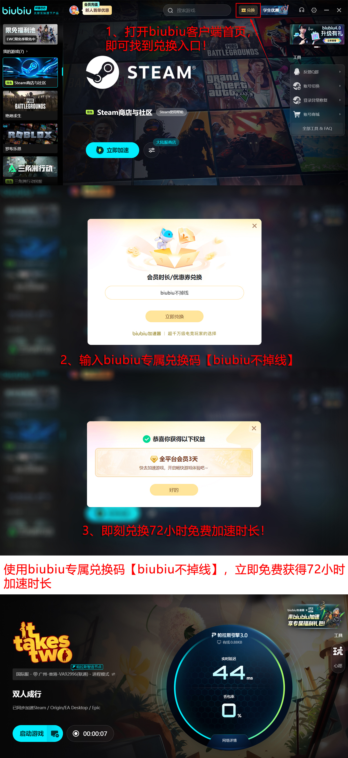 另外,输入专属暗号【biubiu不掉线】即可领取三天免费加速时长;新用户首次注册还可额外获赠24小时会员权益。两项叠加后,总计可享受96小时无限制加速服务,完全覆盖通关全程所需时间。