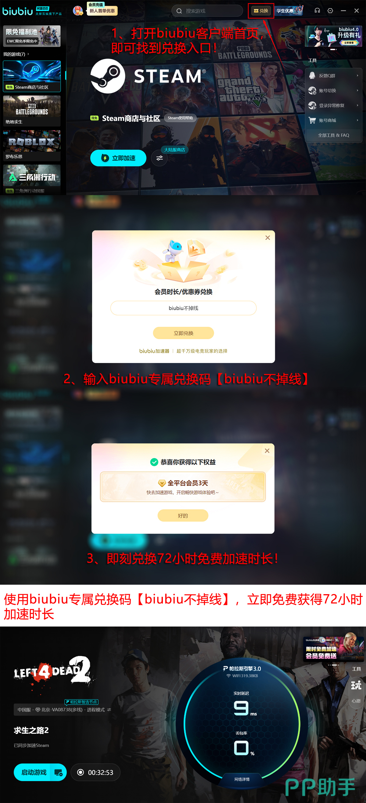 目前新用户可通过口令【biubiu不掉线】免费激活三天全功能加速权限;完成注册并首次登录后,系统将自动追加24小时专属提速时长。两项权益叠加使用,总计可享96小时零成本加速服务。