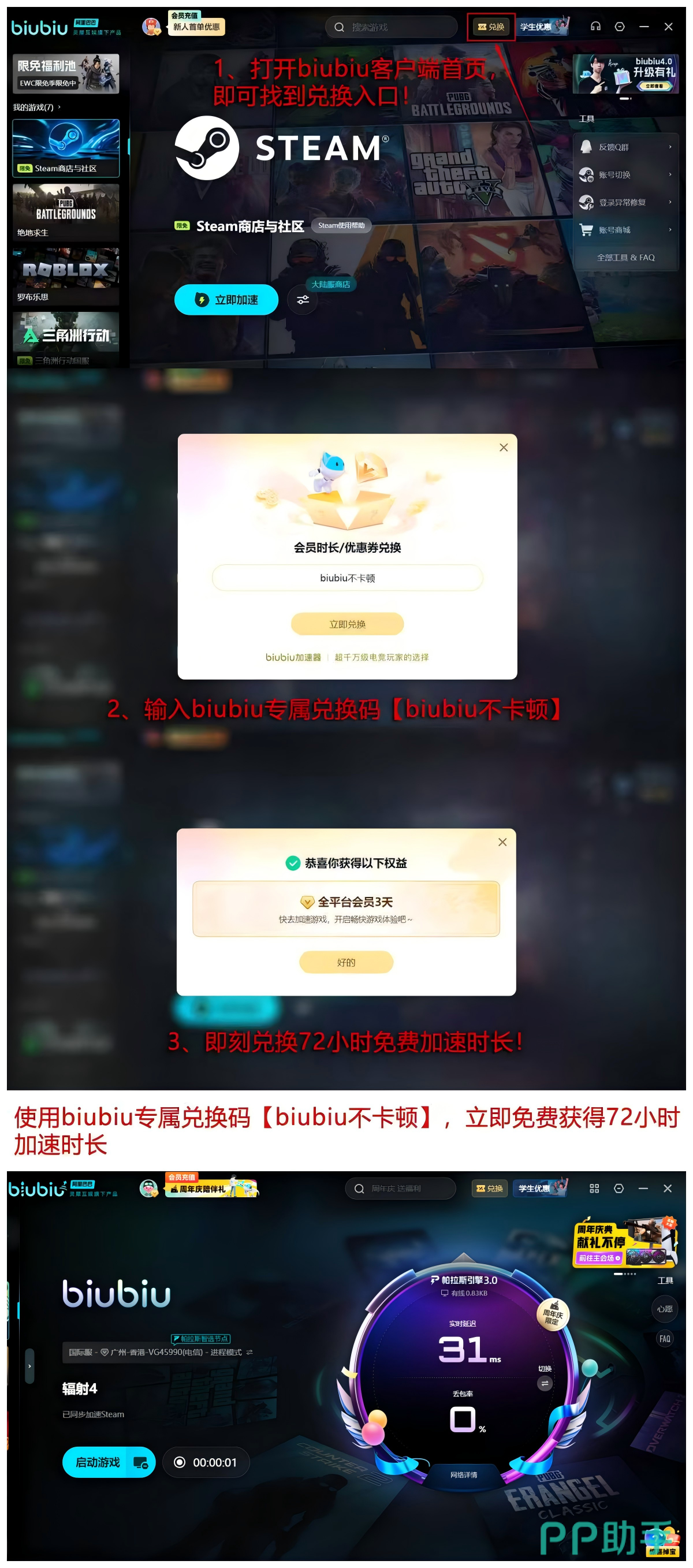 【biubiu不卡顿】是加速器的福利之一,输入就能获取72小时加速,首次登录的新人用户可以获取24小时,累计加在一起可以获得96小时的加速时间,这些时间虽然对于长期游戏的玩家不算很多,但是对于想要体验加速器的加速实力的玩家来说可以说非常好用的。