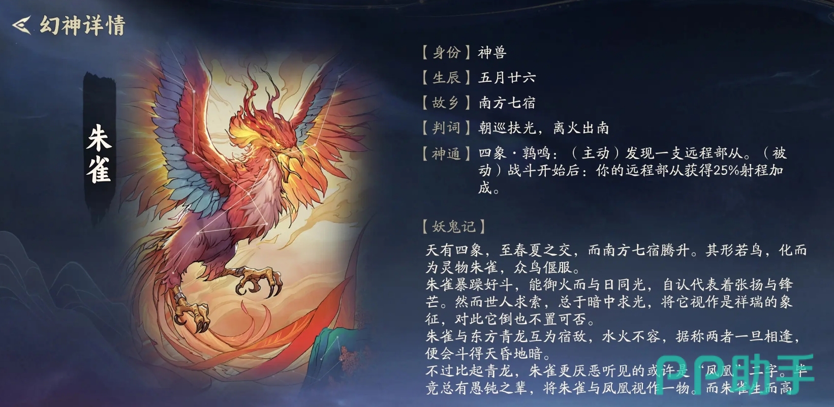 朱雀专精远程体系构建,具备双重实用机制:其一为主动发现功能,可定向提升远程部从的出现概率,加速远程阵容搭建;其二为常驻被动——所有己方在场远程部从获得25%射程加成。该效果全程生效,使敌方难以近身,大幅提升远程单位的生存空间与火力覆盖范围,是阵地战与拉锯战中的核心支撑。