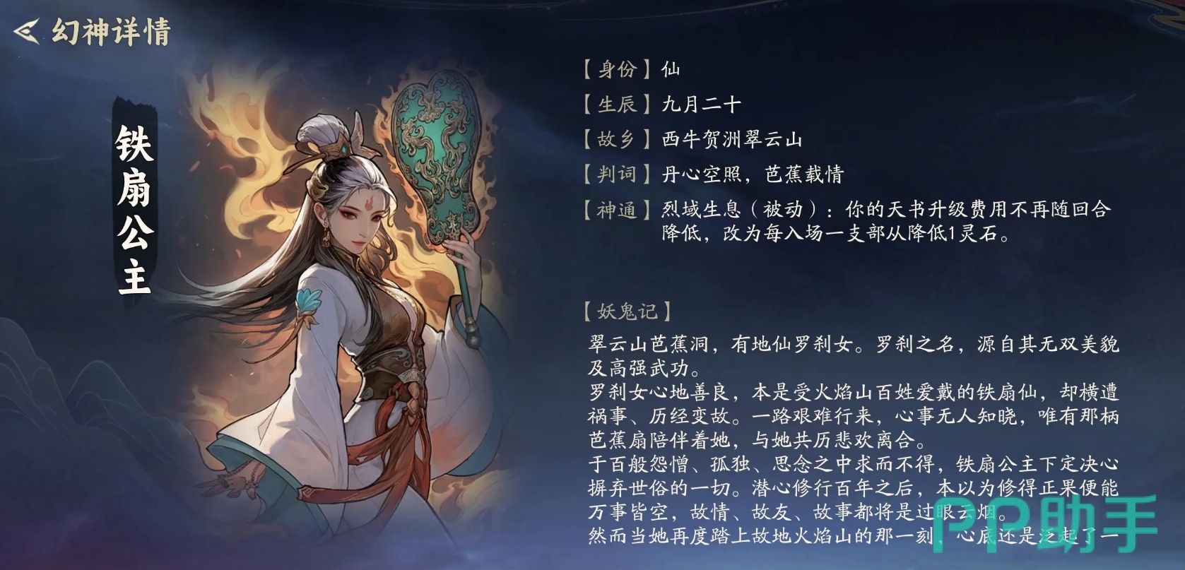 铁扇公主侧重资源调度与成长节奏控制。其机制为:每部署一部从,天书升级所需灵石减少1点(且不受回合数影响)。该效果在前期尤为突出,可帮助玩家比对手更早升至高等级天书,优先抽取三星及以上高品质部从,抢占质量优势。虽需一定运营规划能力,但熟练掌握后,阵容成型速度与上限均明显高于常规路线。