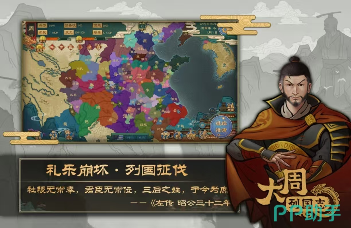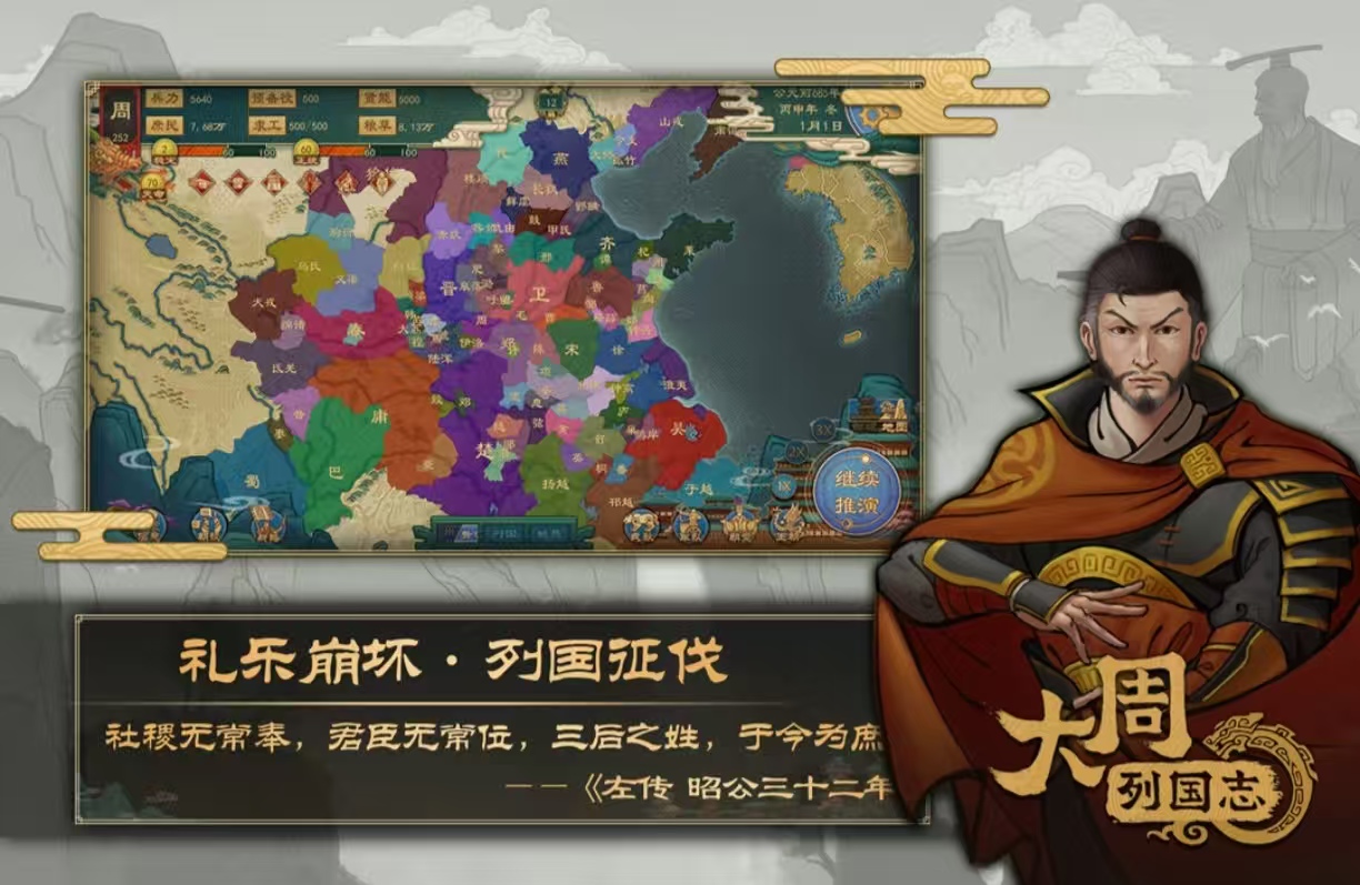 深度还原西周至春秋时期诸侯割据格局,内含十余个可选国家势力。玩家需平衡内政(农田开垦、水利修建、人口管理)、军事(兵种搭配、将领培养、阵型布设)与外交(结盟、联姻、质子交换、朝贡体系)。角色形象、服饰礼器严格参照考古成果设计,武将属性含统率、武力、智力、政治四维成长体系,影响战阵指挥效率与内政执行效果。地图资源分布明确,支持自定义继承人制度与宗法改革。