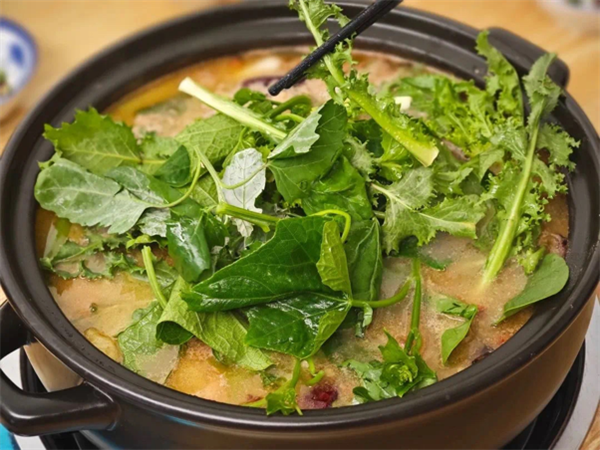 以熬煮了数小时的筒子骨汤或土鸡汤做底,乳白醇厚的汤看似简单,却是野菜的最佳舞台。这些野菜大多带着一丝清苦,在滚烫的骨汤中轻涮片刻后,苦味会被柔和,鲜甜被激发,再蘸上糊辣子蘸水,野菜裹着焦香热辣的蘸料入口,山野的清新与人间烟火的浓烈瞬间交融。