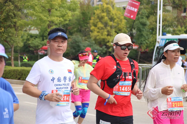 在参赛选手中,有一支特殊队伍,既是参赛选手,也是赛事安保力量,他们是来自全国各地的“警察护跑团”。“护跑团”200名民警辅警统一佩戴印有反诈标语的号码布和布标,成为比赛中的流动宣传阵地,他们和参赛选手奔跑竞逐的同时,也肩负起维护赛道秩序与保障选手安全的职责,为比赛增添了一道靓丽的风“警”线。