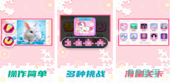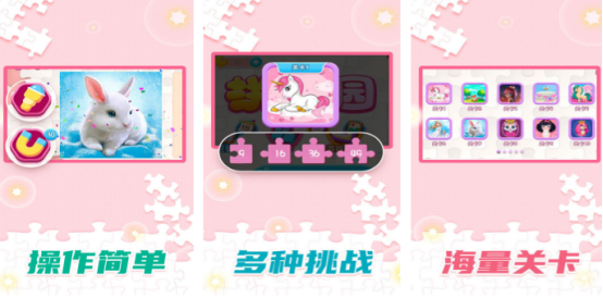 主打童话风格视觉体验,共设30余关卡,每关对应独立主题与难度参数。碎片数量从9片起逐步递增至49片,强调色块识别与色调匹配能力。图库含独角兽、卡通萌宠等高人气元素,用户可自定义选择目标图像进行拼合训练。
