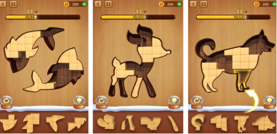 采用极简木质纹理界面设计,规则直观易懂。拼图组件包含不规则多边形及动物轮廓等具象图形,用户通过手指拖放实现空间嵌套,完成从碎片到整体的结构重构。图库持续更新,确保拼图组合具备新鲜感与重复可玩性。