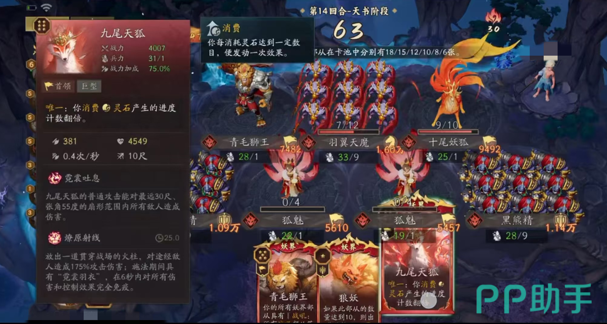 先来看一下消费流,这种玩法的核心是通过消耗资源来换战力,成型快输出稳定。开局直接用骰子刷出蜘蛛精,依靠蜘蛛精每回合消耗7灵力,能换取16点妖气的特点去积攒资源。在三回合之内凑齐5点妖气,就能够稳定回血。在中期选择女妖、天魔等单位稳住战局锁血量,以便快速升到5本。后期主要选择羽翼天魔、金翅大鹏、九尾天狐和雷鸟怪等。羽翼天魔用于增加突击部从的数量,金翅大鹏可以根据突击部从的数量拿灵石,九尾天狐的作用是让灵石消费进度直接翻倍,雷鸟怪还可以再次增加突击部从的数量,这样就实现了资源和战力的滚雪球式增长。