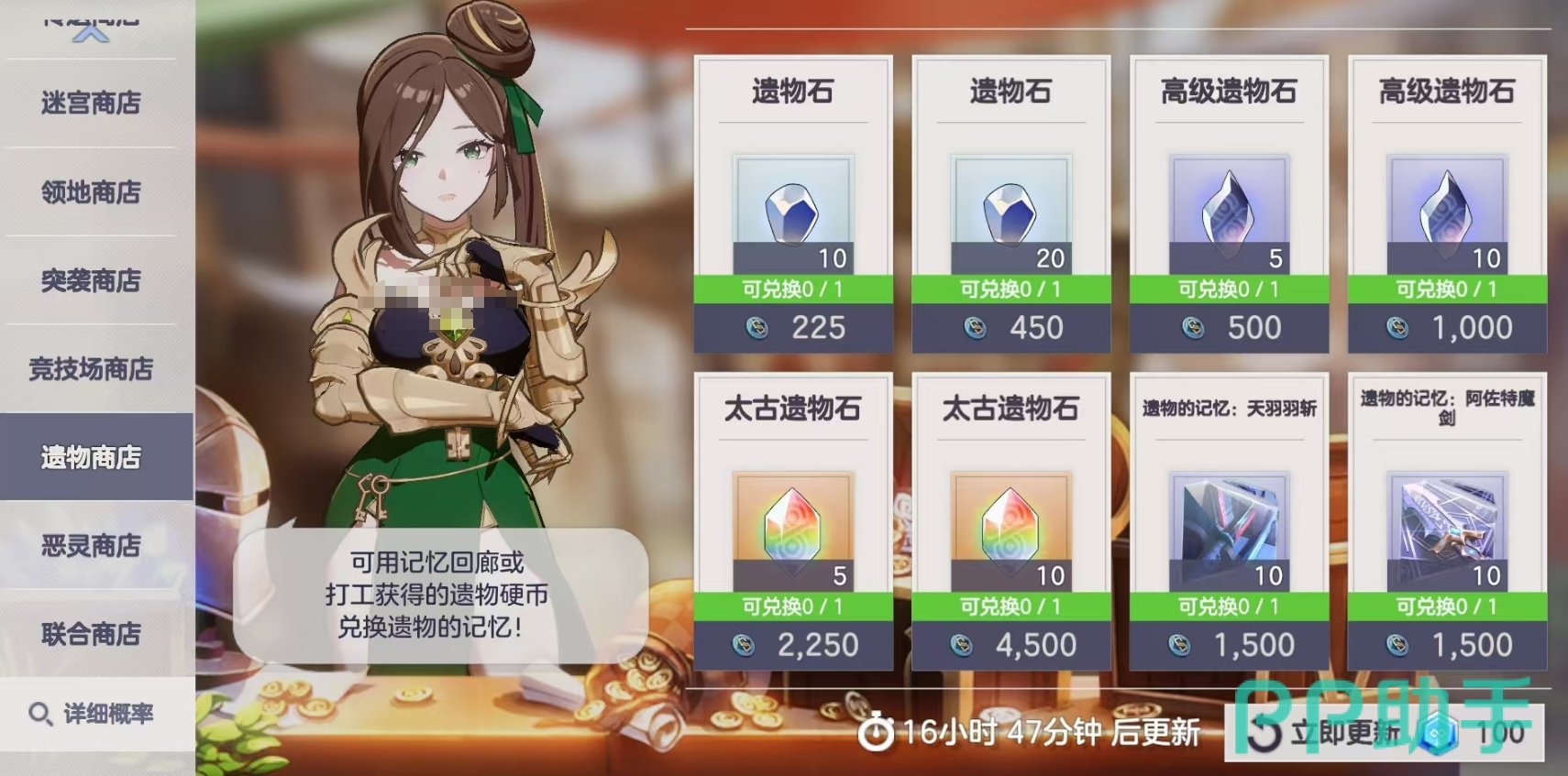 遗物硬币专用于史诗遗物升阶,达成满阶状态后即停止兑换;富余部分可酌情换取太古遗物石或高级遗物石;注意:普通遗物石无需在此采购,记忆回廊中产出丰富,完全满足日常需求。