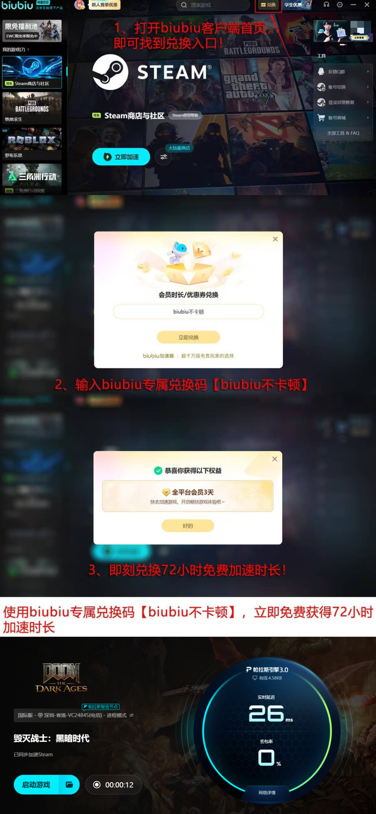对于轻度游戏玩家而言,网络问题可能不易察觉;但一旦进入《毁灭战士:黑暗时代》这类高帧率、低容错的硬核射击环境,网络质量便成为决定胜负的关键变量。建议用户在开黑前主动启用加速服务,提前规避路由拥堵、跨网传输异常等潜在风险。新用户注册后即可获得24小时全功能试用权限,另享三日完整体验期,输入口令码【biubiu不卡顿】即可即时激活。