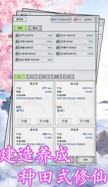 以东方修真文化为基底的养成向手游。玩家扮演初入仙途的凡人,通过点击功法界面、炼丹炉、灵田等模块推进修炼进程。前期侧重资源积累与境界稳固,后期开放飞升试炼、宗门争霸等高阶玩法,修为增长曲线呈阶梯式跃升。个人洞府系统支持自由布置阵法、灵兽栏与藏经阁,所有建筑均可点击交互,资源产出效率随布局优化而动态变化。