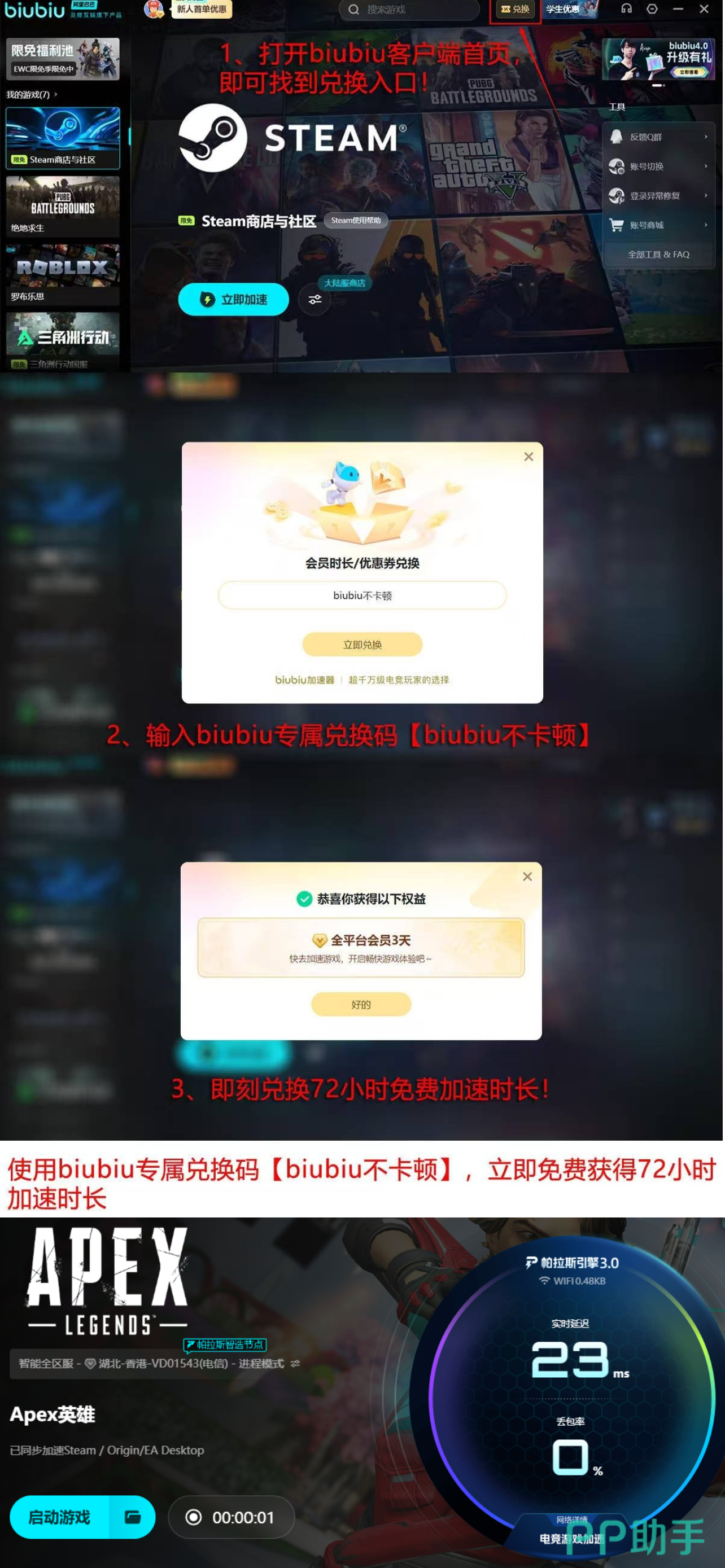 实际使用中,语音通话清晰度明显提升,队友报点更及时,攻防节奏衔接更自然;弹道反馈更精准,技能释放无滞后,移动靶命中率显著提高。为便于新用户直观感受效果,biubiu加速器提供新人专属福利:注册即赠24小时免费加速时长;输入兑换码【biubiu不卡顿】,还可额外领取3天加速权限,总计可享4天无门槛试用。真实体验过后,再判断是否继续使用,决策更理性,顾虑更少。