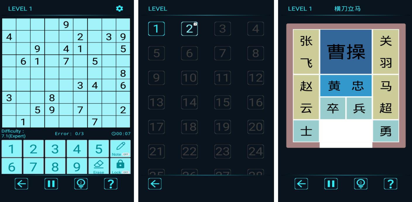 这是一款集成式益智合集应用,内含数独、华容道等共8种经典智力玩法。无需频繁切换应用,即可在统一界面中自由选择不同模式。每类小游戏均设置入门、进阶与专家三档难度,适配新手到高阶玩家。界面设计清爽直观,操作响应迅速,在保证挑战深度的同时兼顾休闲节奏。