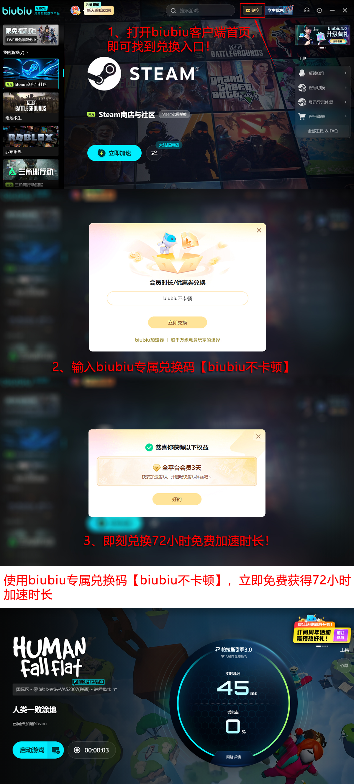 首次使用用户可免费领取24小时加速时长,用于实测优化效果。所有用户输入兑换码【biubiu不卡顿】,即可额外获赠72小时加速权益,新用户累计享有96小时免付费体验,充分覆盖多周目探索、全关卡挑战及多人协作训练需求。