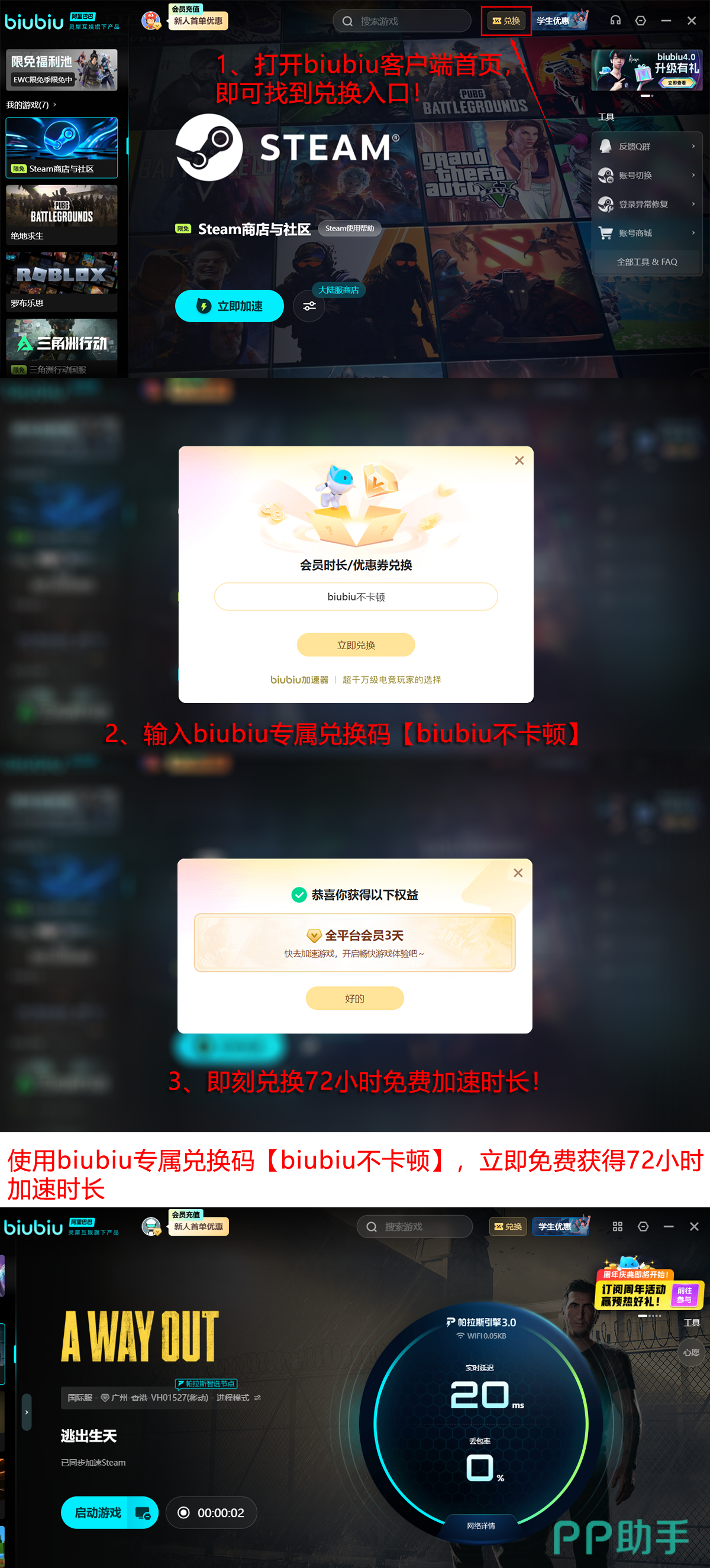 新用户注册即享24小时全功能免费试用权限,零门槛体验加速效果。此外,输入兑换码【biubiu不卡顿】还可额外领取三日连续加速服务,适用于所有账户类型,不限新老用户。即使基础网络条件有限,也能维持长时间稳定运行,从容应对多阶段战术推进与高难度生存挑战。