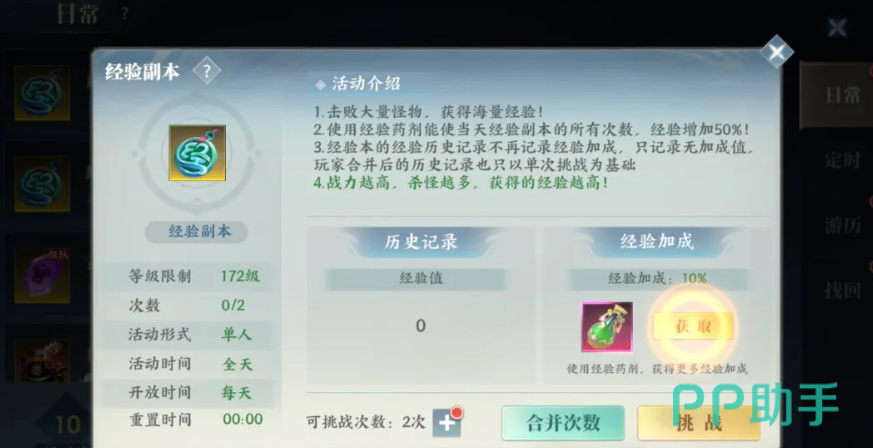 角色等级是前期所有养成维度的基础支撑。除推进主线任务外,经验副本为最稳定的经验来源。该副本每日开放两次挑战机会,且在每日0点重置后可重复参与。副本机制采用全自动挂机模式,操作门槛极低;实际收益与角色战力呈正相关——战力越高,单次通关耗时越短,经验产出总量越高。此外,副本内击杀目标数量会触发经验加成系数,进一步放大收益效率。