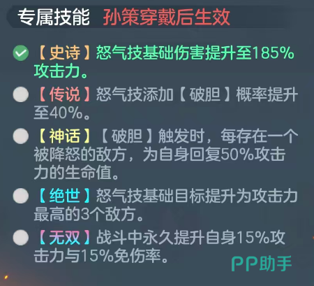武器达绝世品质后,怒气技能升级为三目标锁定打击,显著提升群体压制能力;晋升无双品质后,则永久获得15%免伤加成,进一步夯实生存根基。结合其他增益机制,孙策逐步演化为攻守兼备的全能型主力输出。