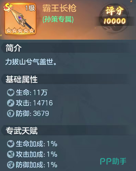 孙策的基础定位为高机动单体爆发型输出,但实际战斗中展现出显著的多目标压制潜力。其关键战力增幅高度依赖专属武器“霸王长枪”——当该武器升至史诗品质时,可为其怒气技能提供高额固定攻击加成,并基于基础伤害数值额外附加百分比伤害提升,大幅强化技能爆发效率。