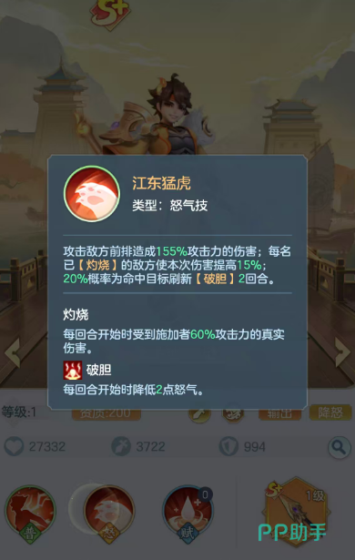 怒气技能对前排目标造成155%伤害,若目标已存在灼烧状态,则额外提升15%基础伤害;同时拥有20%概率触发“破绽”效果,直接削减敌方怒气值。该机制可有效干扰依赖怒气释放大招的敌方核心武将,打乱其技能节奏,具备战术层面的战略价值。