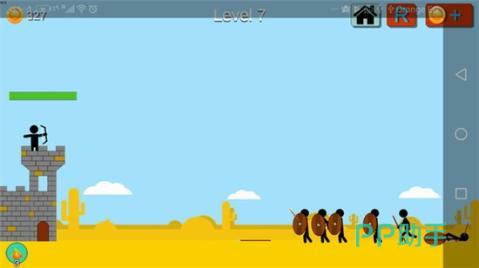 本作以极简矢量画风呈现,融合火柴人角色设定,突出操作直观性与打击爽感。敌方单位具备差异化行为逻辑:持盾步兵可格挡正面箭矢,跳跃型敌人频繁位移干扰瞄准节奏,部分关卡还限定使用特定弓具完成目标。玩家需结合弹道预判、技能冷却与地形遮蔽制定战术,强调技巧性而非单纯数值堆砌。