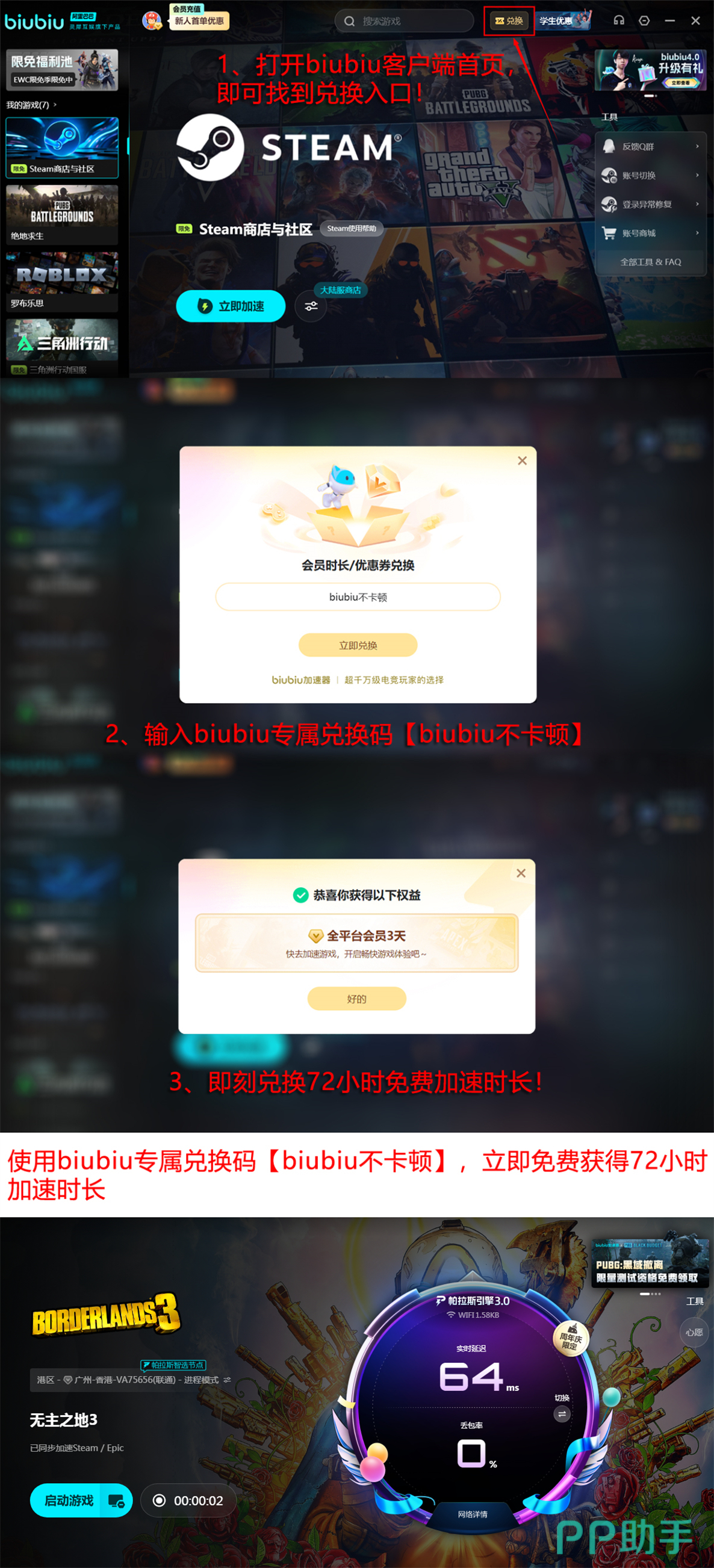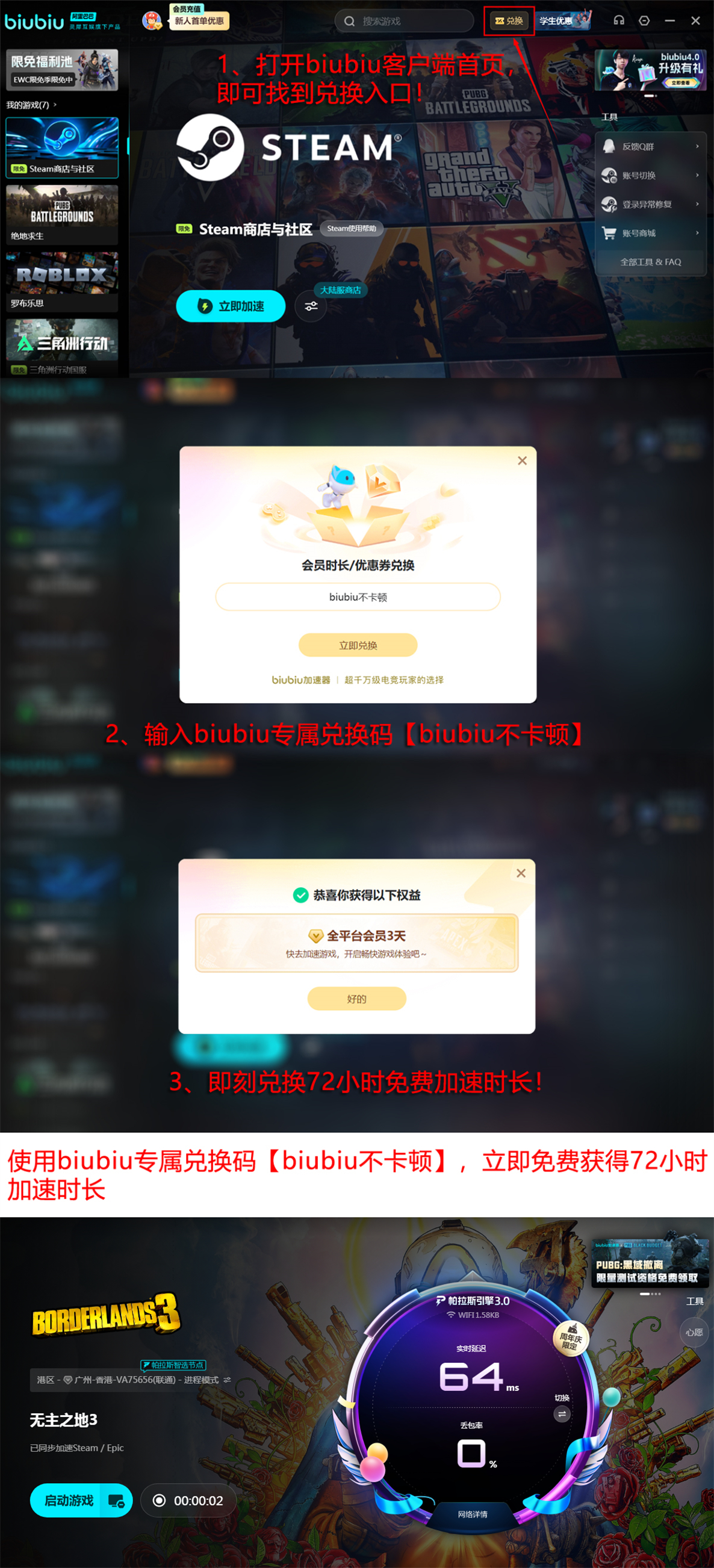 为便于用户快速验证优化效果,目前新注册用户可立即获得24小时全功能免费加速权限。完成账号创建后,进入客户端兑换栏,输入专属激活码【biubiu不卡顿】,即可额外领取连续三天的加速服务,每个账号限用一次。