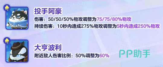 首先是蛋仔调整,投手阿豪的伤害将从50%、50%、50%物攻,变为75%、75%、80%物攻,并且10秒内造成270%的持续伤,调整为5秒内造成250%,大亨波利将对附近敌人伤害比例从50%调整到60%。