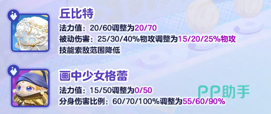 削弱的蛋仔有丘比特和画中少女格蕾,丘比特将法力值从20、60调整为20、70,被动伤害从25%、30、40调整为15、20、25%物攻,并且索敌范围降低,格蕾法力值从15、50调整到0、50,分身伤害比例从60、70、100%变为55、60、90%。