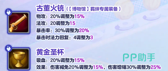 黄金圣杯吸血从20下降到15,伤害减免效果从20%降低到15%,伤害增幅从30%降低到25%,羁绊上刚毅法师法攻从20、50、85、120变为25、60、100、150,肉蛋带来的全队生命力从100变为150,双黄蛋第二次技能伤害比例从35、60、100变成45、75、120,刚毅战士的吸血从15%降低到10%。