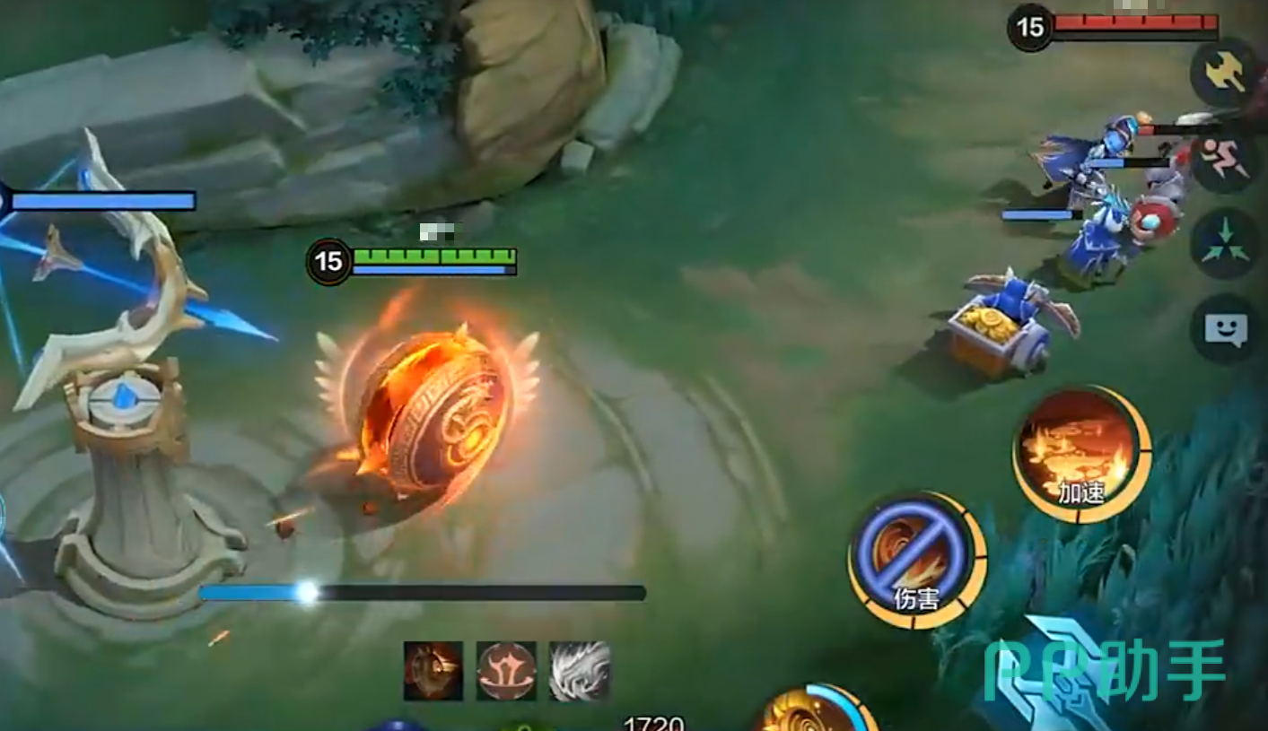 1技能释放,他会缩在护盾当中,加速进行翻滚,翻滚中再次使用1技能,可越过阻挡物或者敌方小兵,在跃起的过程中,如果身下有敌方英雄,会立刻砸向并眩晕该目标,同时也会对周围造成伤害和击退效果,可理解为强力位移技能,且附带控制效果。