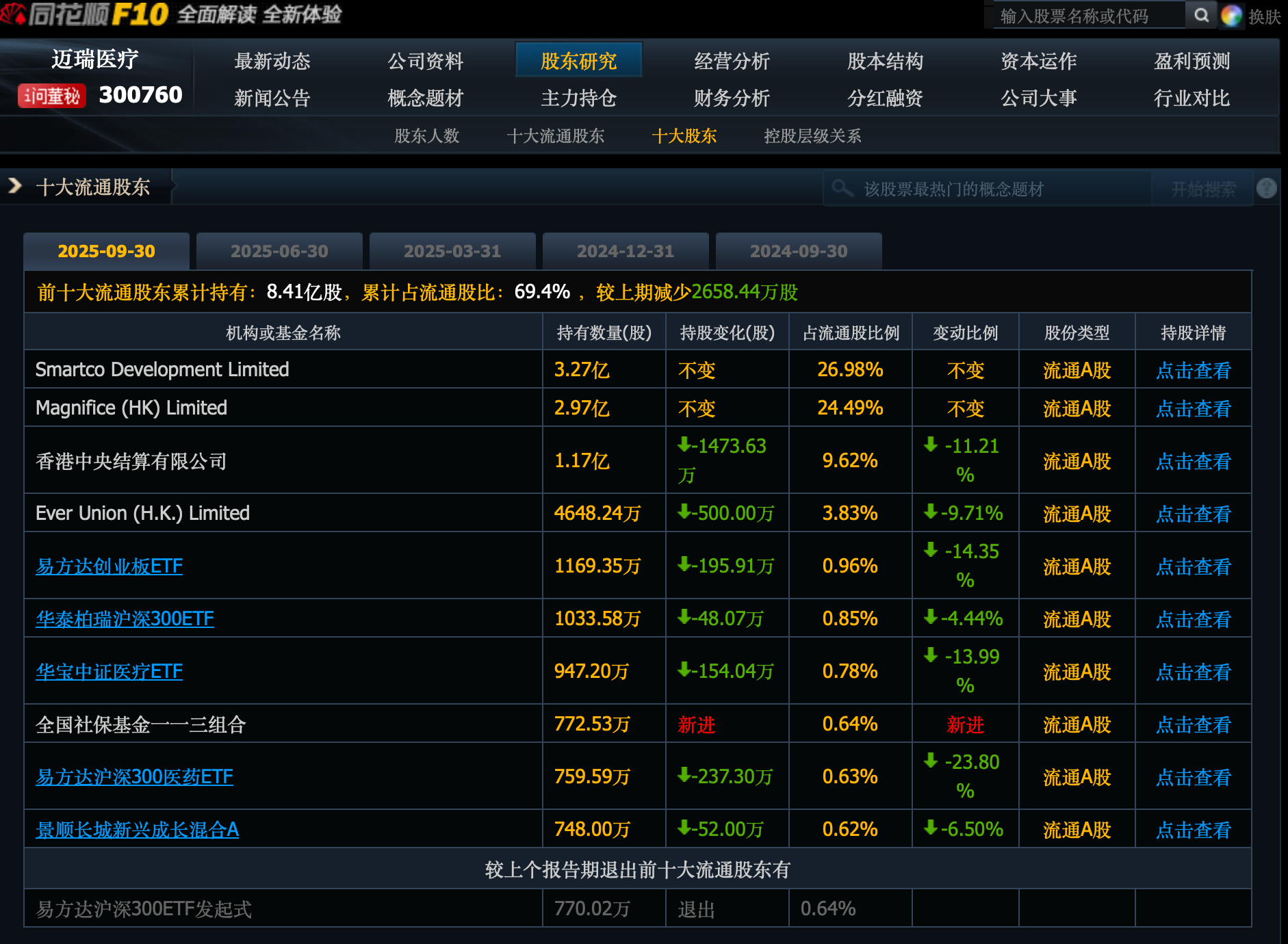 披露显示,同年6月底,上述四个持股平台还依然合共持有迈瑞医疗5000万股。然而,两年后的2025年6月底,这些持股平台都已在迈瑞医疗前十大股东名单中消失。按照期间平均股价粗略估算,套现金额可能已经超过百亿元。