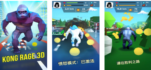 一款融合高速移动与状态切换机制的3D跑酷游戏。主角为具备基础攀爬、翻滚与冲撞能力的大猩猩,可在城市街区与原始丛林双地图间无缝切换。金币收集用于充能“愤怒模式”,触发后获得短暂无敌、加速与范围震击效果。角色动画基于运动捕捉技术优化,配合动态摄像机调度,强化高速穿梭时的空间感知与操作流畅度。