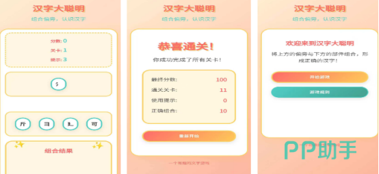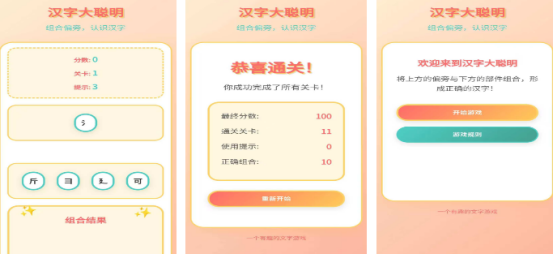 以汉字构形原理为核心教学逻辑,采用闯关式拼图玩法。每关呈现拆分后的偏旁部首或笔画部件,玩家需依据汉字结构知识进行拖拽组合,还原目标字形。关卡难度梯度设置合理,从独体字逐步过渡到复杂合体字。通关后可查看历史记录,包括已解锁关卡数与提示使用次数,并支持角色成长体系,增强持续参与动力。