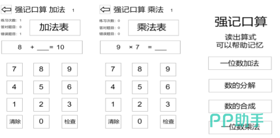 聚焦基础运算能力训练,涵盖一位数加减法、数字分解、凑十法等关键知识点。开局提供四种模式选择,系统随即生成题目,例如“8加几等于10”,下方列有候选数字,玩家须快速调用口诀完成匹配。界面实时统计答对与答错题数,便于家长掌握学习进度与薄弱环节。
