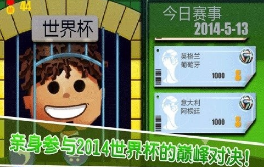 以2014年巴西世界杯为背景的卡通风格足球竞技手游。玩家操控自定义球员参与快节奏进球挑战,操作简洁直观,强调临门一脚的时机把握。游戏提供多样化外观系统,包括球衣、发型、配饰等自由组合选项,支持个性化形象塑造,整体风格幽默诙谐,契合大众休闲娱乐需求。