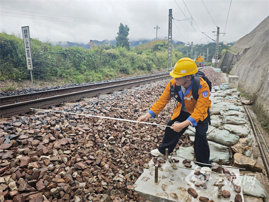 “国庆假期运输已经开启,盘西线客货物列车密度大,我们既要保工期,更要守安全!”黄靖胸前挂着对讲机,手里攥着施工作业单,用洪亮的声音反复强调。