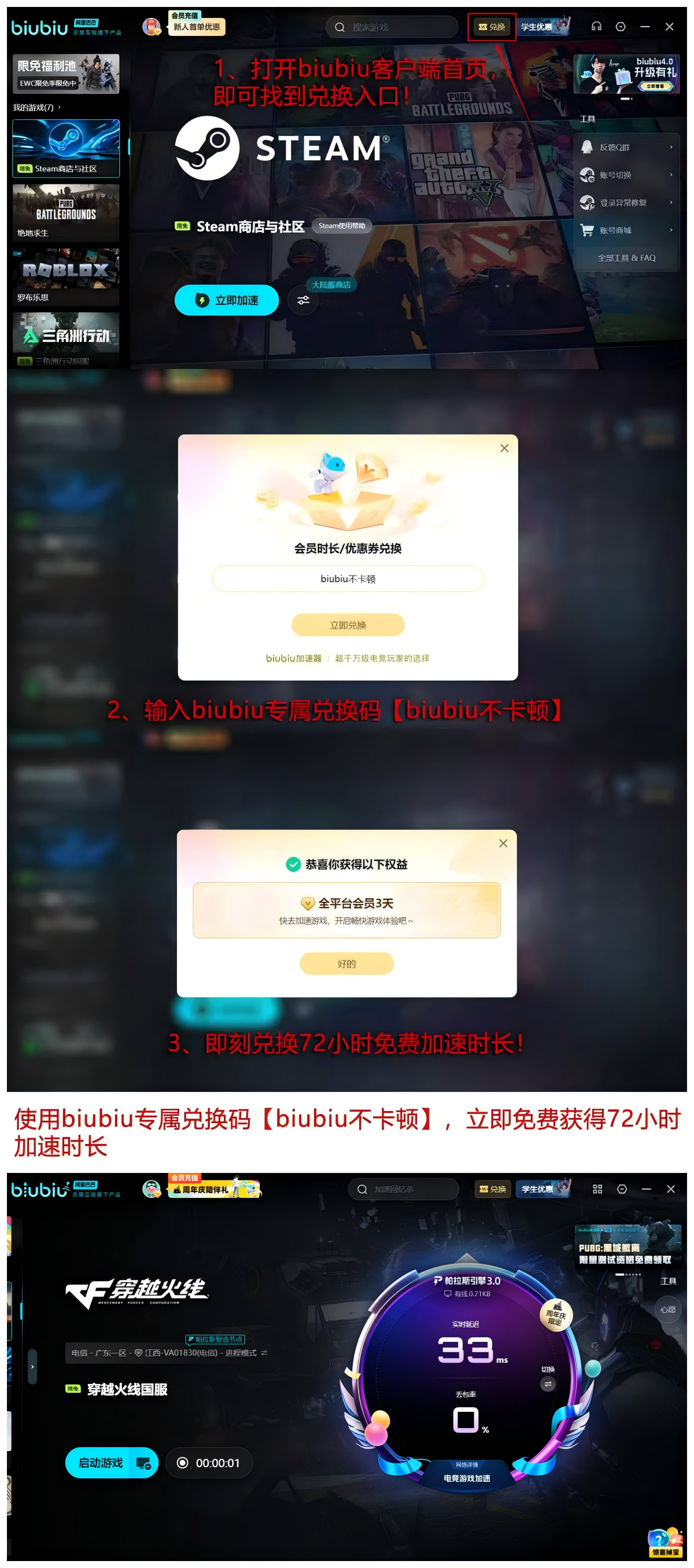 当前主流加速服务普遍采用订阅制收费模式,但本平台提供限时体验通道:输入口令【biubiu不卡顿】即可领取72小时全功能加速权限;新注册用户额外获赠24小时专属加速时长,合计达96小时免费体验周期。该周期足以覆盖多场高强度排位赛及完整新手适应期,助力玩家充分验证优化效果并建立长期使用信心。