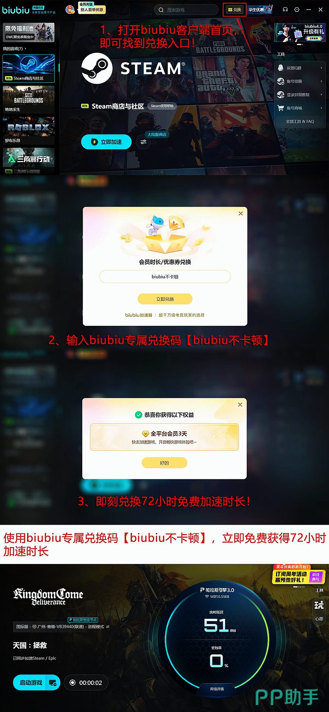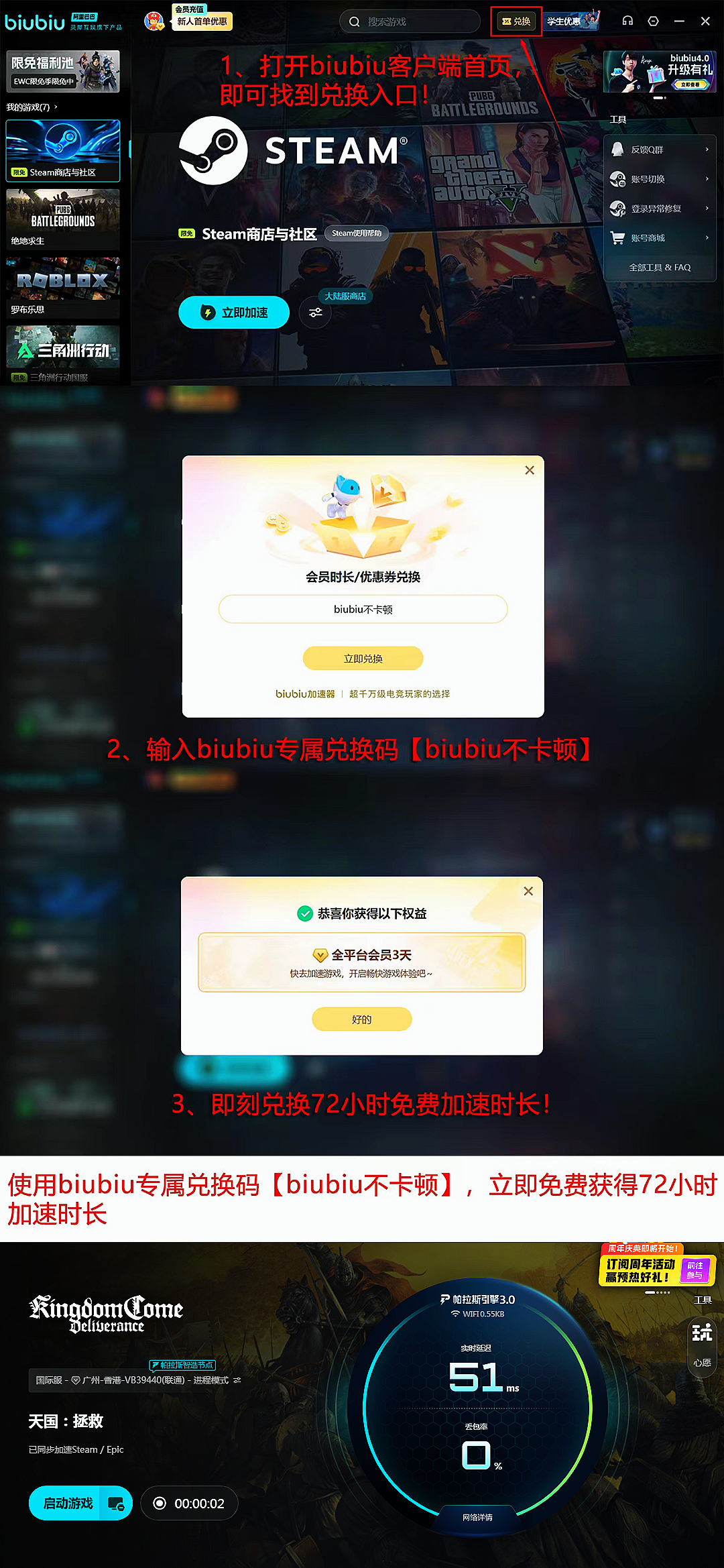 注册biubiu新账号即可领取24小时全游戏通用加速时长;输入兑换码【biubiu不卡顿】还可额外激活3天高级权限,覆盖《天国:拯救》全部在线服务模块。综上所述,面对闪退问题,需结合自身设备状况与使用环境对症处理:本地性能瓶颈优先调优图形设置,安装异常务必重装正版客户端,而网络相关故障则可通过biubiu加速器实现一键式修复。