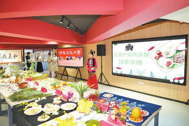 作品展示环节,一道道充满云南风情的创意佳肴惊艳亮相。从诗情画意的“锦绣花开妃子笑”“江南毓秀,雨林风情”,到承载乡情的“户撒阿昌族过手米线”“三月三簸箕宴寻味”,再到别出心裁的“五彩酿壳”“云萃新八碗”,参赛队伍以巧思入菜、以技艺传情,将地方风味、营养理念与创意灵感巧妙融合。现场,身着壮族、白族、景颇族等多彩民族服饰的同学生动解说每一道菜背后的故事,从食材产地、营养搭配,到风味中蕴藏的家乡记忆、摆盘中寄寓的美好愿景……不仅呈现了视觉与味觉的双重盛宴,更传递了“一菜一故事、一味一情怀”的饮食温度。经过激烈角逐与专业评审,大赛最终评选出一等奖3组、二等奖3组、三等奖4组。