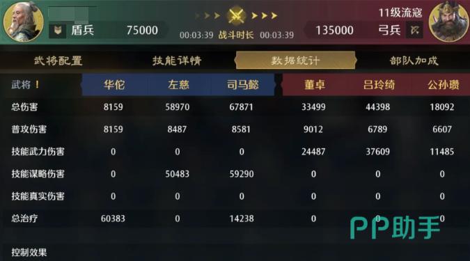 输出这一块则由张角和左慈来补齐,组合双核,左慈的技能可以给张角提供其需要的狂风、雷雨等负面效果,同时附加增伤buff,这样张角在携带谋略类主动技能的时候就更容易触发其二段伤害了,这样就能在短时间内打出极高的爆发。