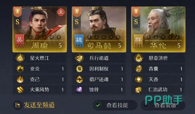 武将方面理想情况下自然是纯群雄三仙最好,但如果缺少了左慈或者张角,也可以用于周瑜、司马懿等智谋型输出武将来替代,整体的思路是不变的。战法选择这一块偏向于主动技或者是智谋类输出技能,重点要保证输出频率和华佗的续航可以匹配上。
